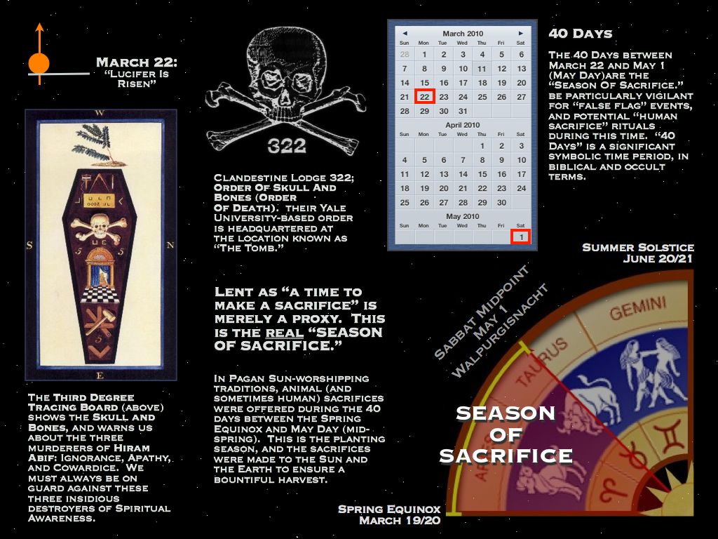 The Season of Sacrifice is a 40-day period between March 19th and May 1st. Its name was coined by the Dark Occultists of this world, otherwise known as the Cabal, Illuminati or NWO, who believe that the Earth must be bathed in the blood of innocents to ensure a fruitful harvest and to invoke an archetype of the destructive forces of the universe.