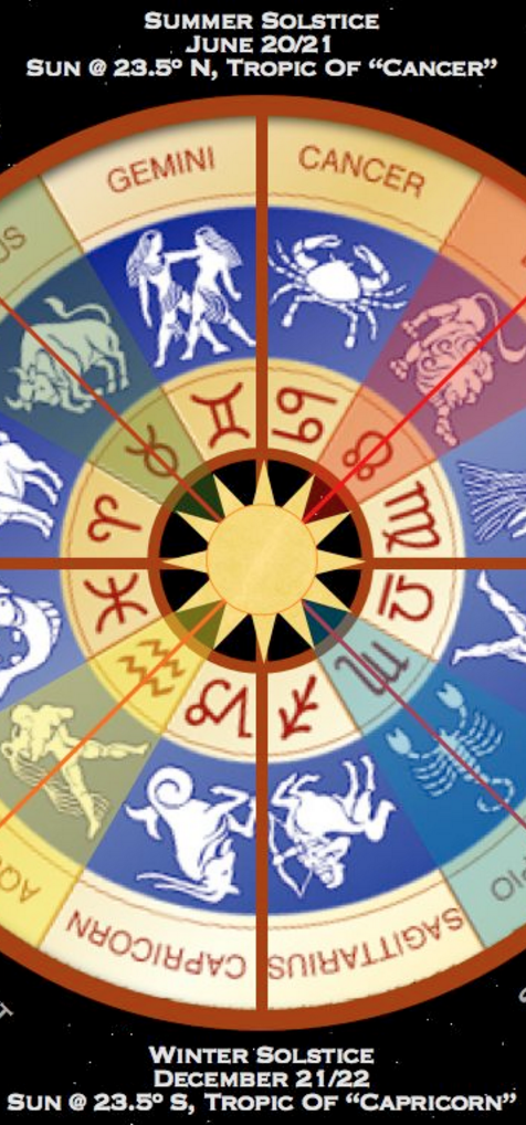 On a standard globe used in geography, one can find the lines marked the Tropic of Cancer and the Tropic of Capricorn. These represent the maximum southern and northern points of the Sun as it moves in the sky throughout the year. When the Sun reaches the angle of 23.5ºN with respect to the equator, the Summer Solstice begins, entering the sign of Cancer. When the sun reaches the angle of 23.5ºS with respect to the equator, the Winter Solstice begins, entering the house of Capricorn.
