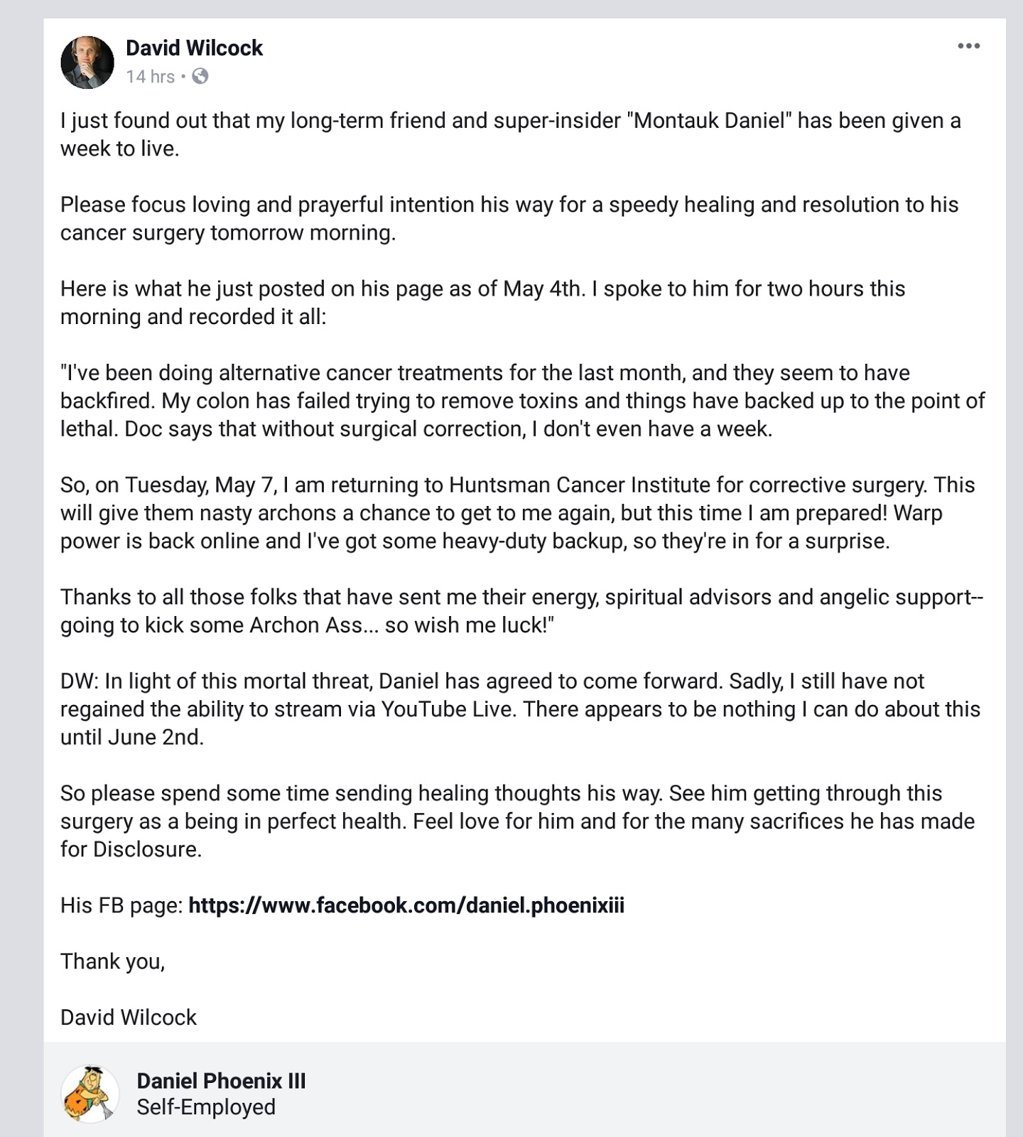 Montauk Daniel, one of David Wilcock’s insiders has been diagnosed with colon cancer. He tried to apply alternative treatment for a month. Unfortunately, the treatment didn’t achieve the desired result and his life is currently at risk.