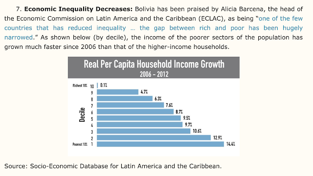 All of the benefits of rapid economic growth went to the lower 90% of the population and hardly anything at all to the top 10% wealthy Bolivians of European extraction who owned and controlled the country before he became President and who have now been restored to power by the US engineered Fascist Military Coup.