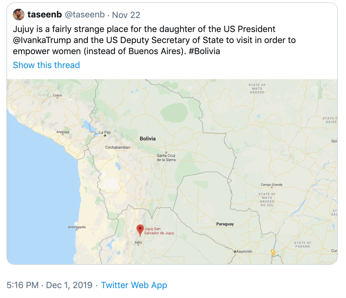 It is now thought the real reason for Ivanka Trump’s strange visit to Jujuy in Northern Argentina, September 5, was to arrange or make the payments to bribe Bolivia’s Army & Police Chiefs with $1m and $500,000 each for the Fascist Military Coup on November 10.
