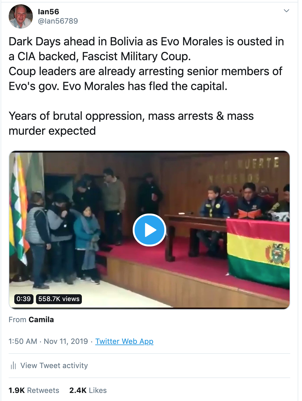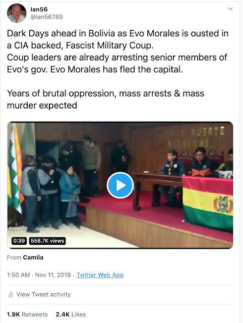 None of the above is ever mentioned in Western Corporate Disinfo Media, who are all supporting the illegal Fascist Military Coup that has put extreme racists into power in Bolivia who are already persecuting and murdering the indigenous people who make up 70% of the population, shutting down the Free Press and rounding up and jailing opposition (Morales supporting) politicians and journalists.