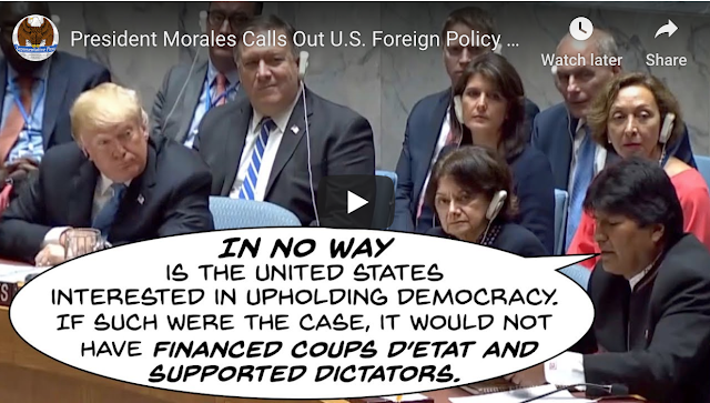 Morales also angered the U.S. government by closing the US military base in Bolivia early in his Presidency, supporting the Palestinians instead of the Israelis, and for making a very famous speech at the UN in 2018, sitting two seats down from Donald Trump and Mike Pompeo at the UN Security Council.