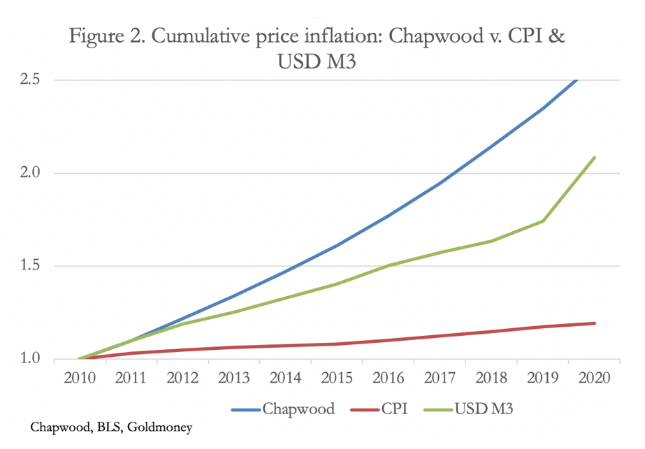 Figure 2 compares the cumulative increase in the general level of prices measured by the CPI, and the Chapwood index — comprised of “the top 500 items on which Americans spend their after-tax dollars in the 50 largest cities in the nation”.[v] The Chapwood price inflation numbers used in the chart are the arithmetic average of the fifty cities, the last data points being end-June 2020. Additionally, the growth of M3 money supply is included.
