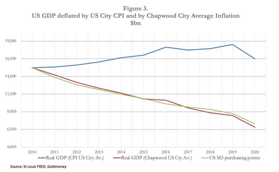 Figure 3 further illustrates the ineffectiveness of monetary policy by expressing GDP in 2010 prices adjusted by the CPI (the state’s version of real GDP), by the Chapwood index and finally by M3 money supply.