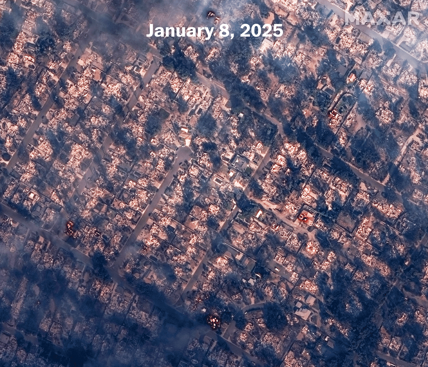 Using shortwave infrared imagery, Maxar captured shots of burning homes in Altadena. Below is a blended image showing the hundreds of fires that ravaged the area.