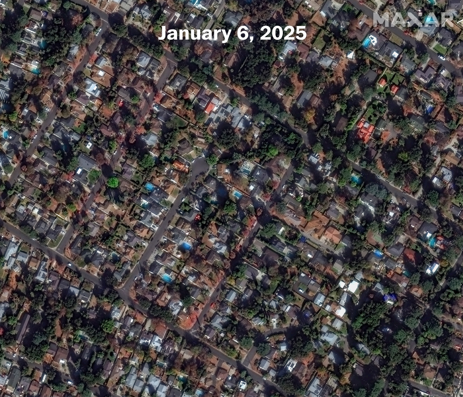 Maxar, a commercial imaging firm, captured the destruction of the Los Angeles fires on Wednesday afternoon. The satellite imagery reveals how entire neighborhood blocks were completely burned. The following shows destroyed houses near Marathon Road in Altadena, California.