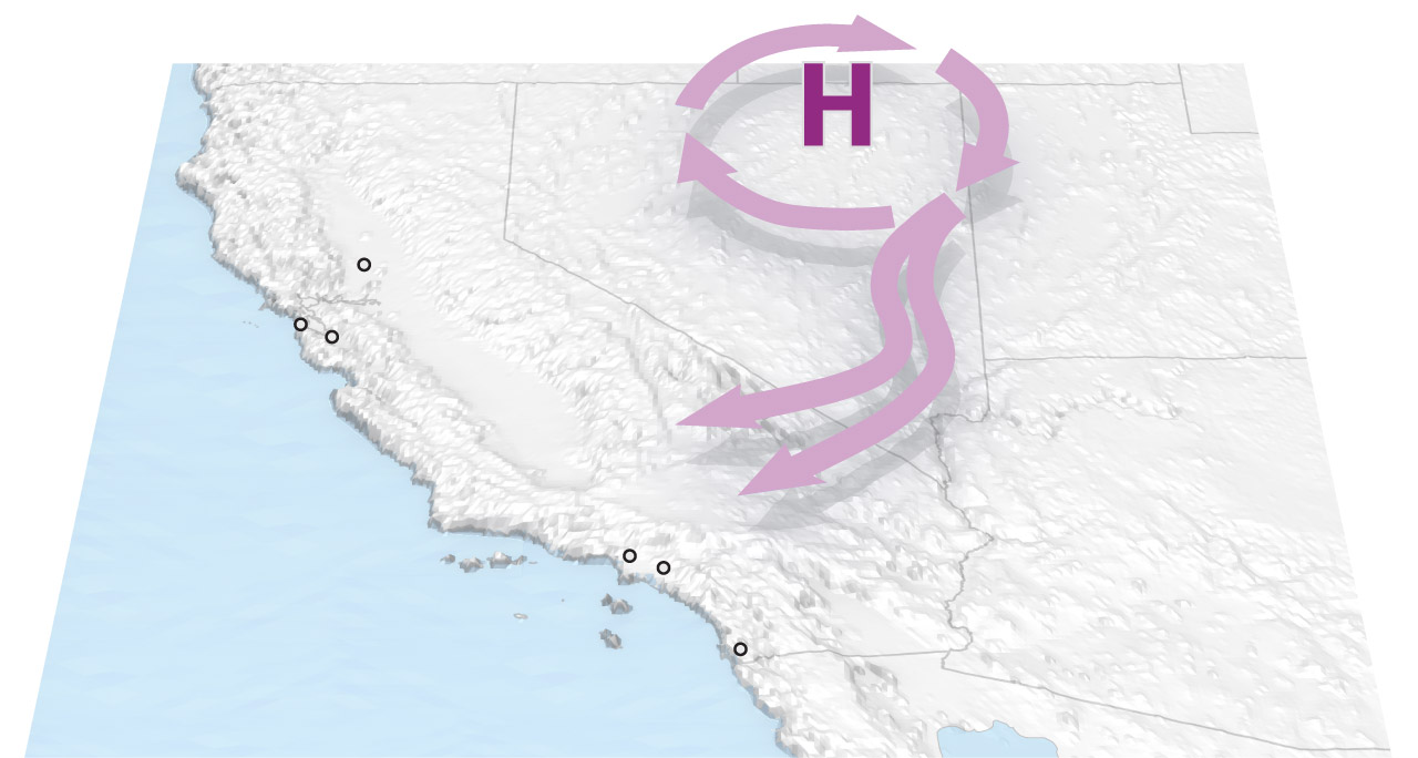 Santa Ana winds occur when a high-pressure system forms over the deserts of the Great Basin. The high pressure circulates clockwise, pushing air westward toward the lower-pressure areas of the coast. This region experiences Santa Ana windstorms multiple times a year.