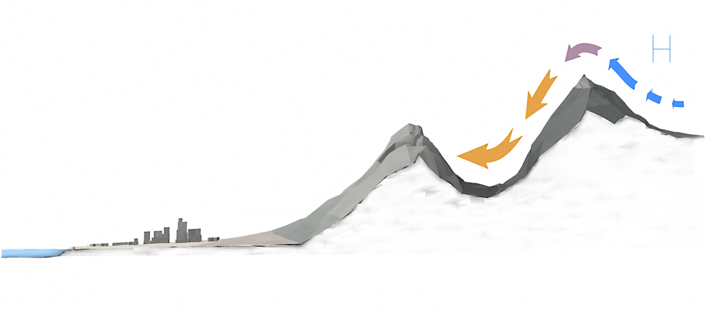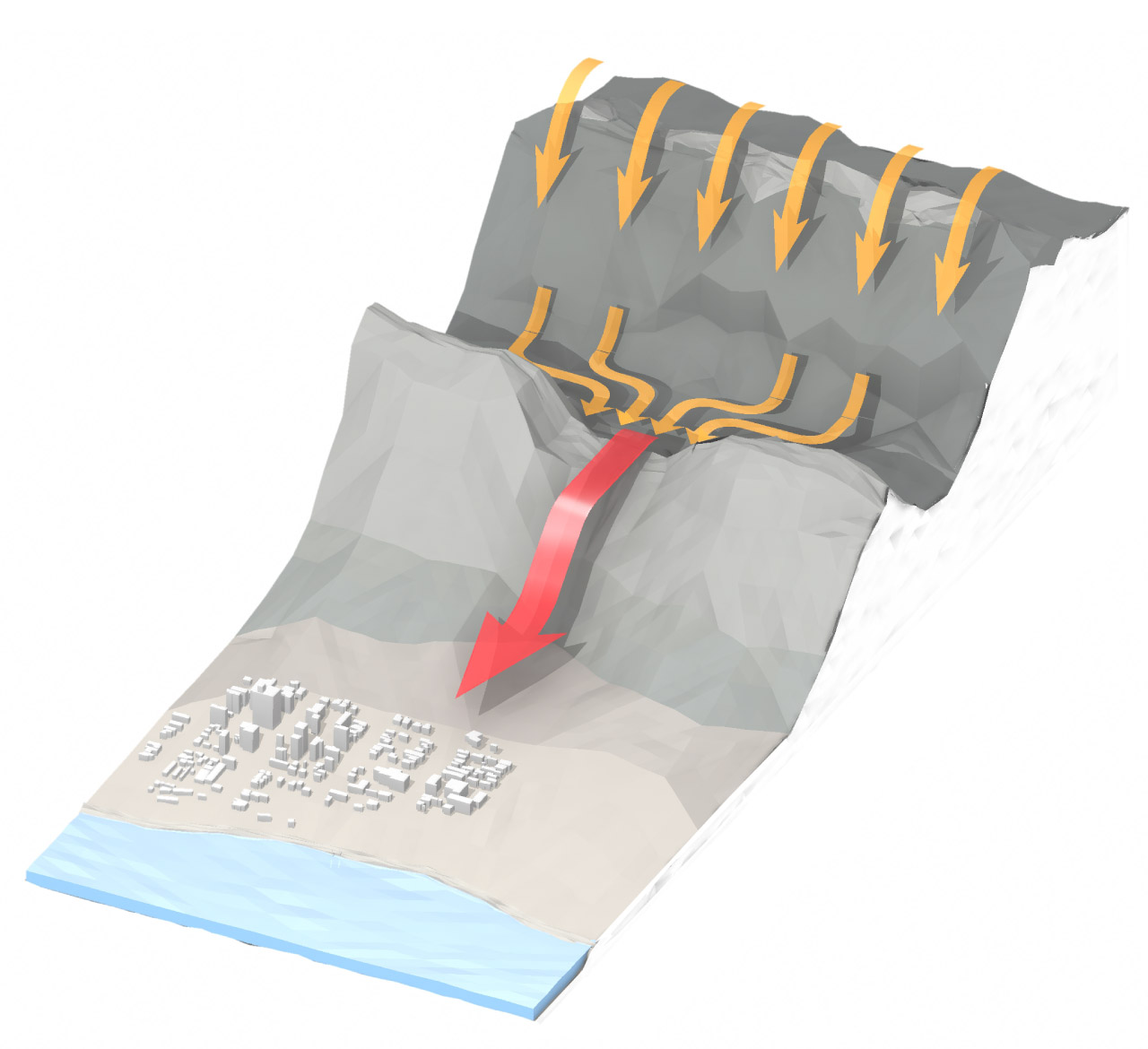 Warm, dry air Mountains, Fast-moving, hot, dry air Valley, Coast.
