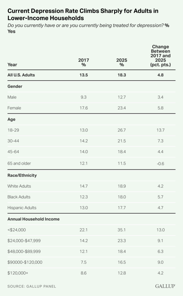 Among those in households earning under $24,000 per year, reports of depression have risen from 22.1% in 2017 to 26.1% in 2023 to 35.1% now, a 13-point increase in eight years. The change for these lower-earning Americans is particularly notable given the nine-point increase since 2023.