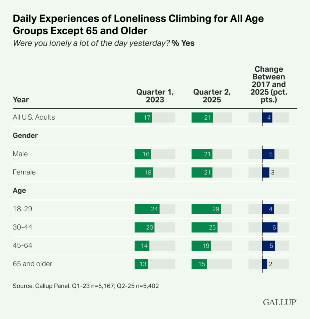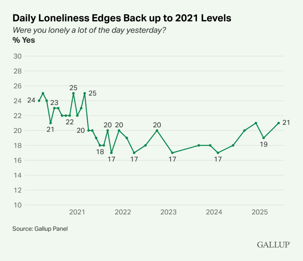 After declining from pandemic-era highs of 25% to a range of 17% to 18% through much of 2022 and 2023, reports of individuals experiencing significant loneliness “a lot of the day yesterday” have inched upward again since the latter half of 2024 to 21%.