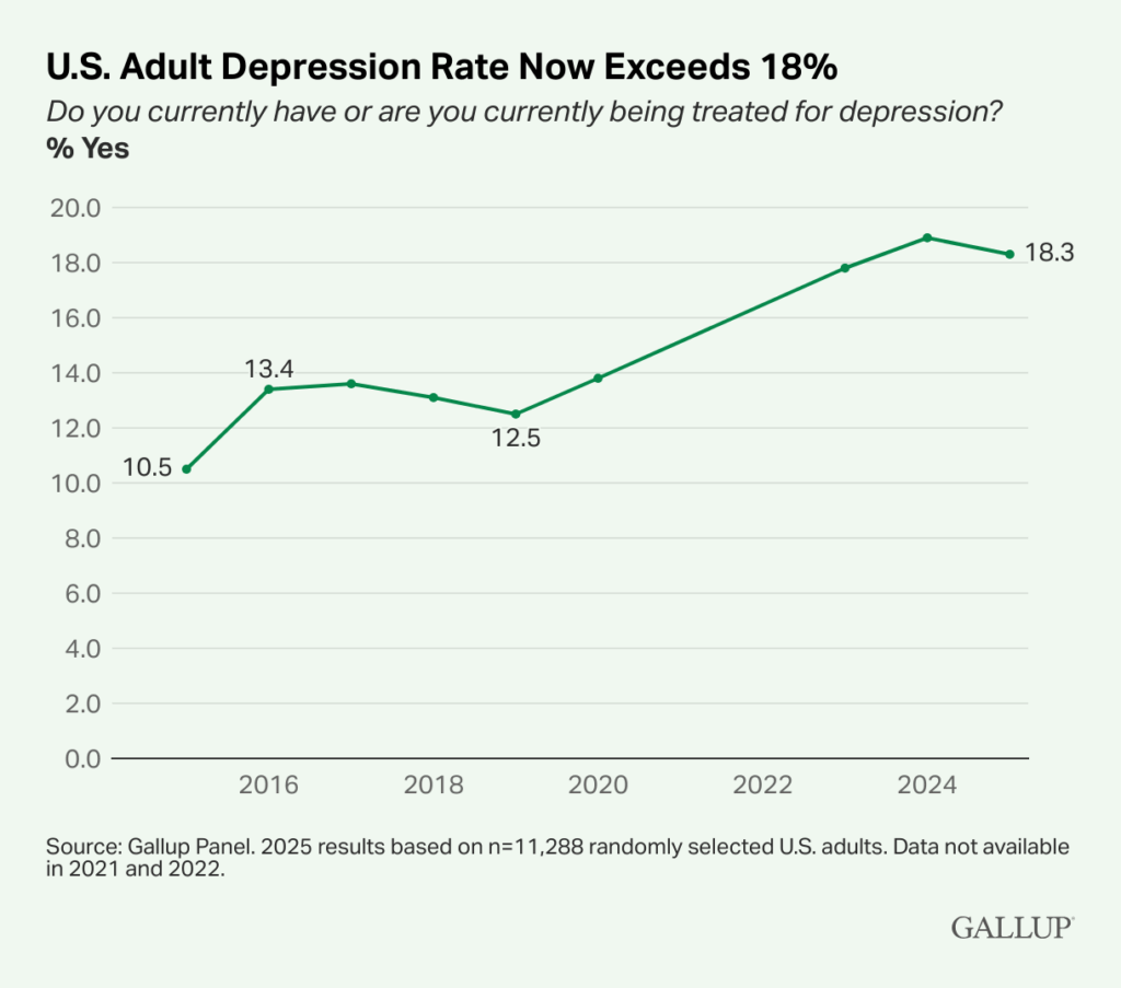 WASHINGTON, D.C. — The percentage of U.S. adults who report currently having or being treated for depression has exceeded 18% in both 2024 and 2025, up about eight percentage points since the initial measurement in 2015. The current rate of 18.3% measured so far in 2025 projects to an estimated 47.8 million Americans suffering from depression. Most of the increase has occurred since the onset of the COVID-19 pandemic in 2020.