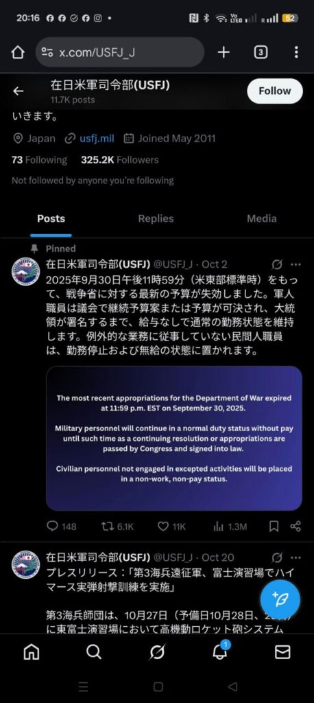 According to the official social media account of the US Forces Japan, they have been working without pay since October 2nd. There is no information that their salaries have resumed since then. US military personnel in Japan are working without pay, and base events are being canceled one after another.