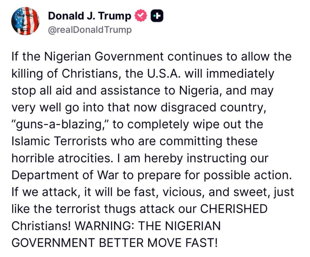 If the Nigerian Government continues to allow the killing of Christians, the U.S.A. will immediately stop all aid and assistance to Nigeria, and may very well go into that now disgraced country, “guns-a-blazing,” to completely wipe out the Islamic Terrorists who are committing these horrible atrocities. I am hereby instructing our Department of War to prepare for possible action.