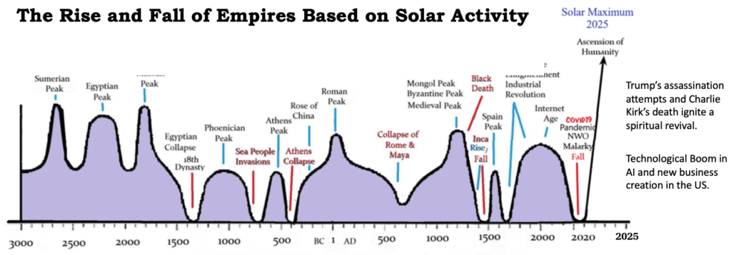 Solar Cycle 25 (peaking 2024–26) is moderate, but forecasts show a decline toward mid-century, possibly another Gleissberg-scale 88-year cycle dip. If history repeats as anticipated, this could mark the Crisis → Renewal pivot of the 21st century: old institutions faltering under stress, new systems germinating beneath them.