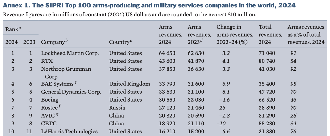 “In 2024,” the report explains, “the growing demand for military equipment around the world, primarily linked to rising geopolitical tensions, accelerated the increase in total Top 100 arms revenues seen in 2023. More than three-quarters of companies in the Top 100 (77 companies) increased their arms revenues in 2024, with 42 reporting at least double-digit percentage growth.”