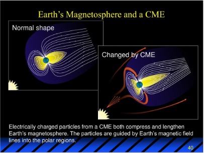 Some of the intense solar flares and coronal mass ejections (CMEs) are sending plasma, electrons, and protons at speeds up to a million miles per hour. Some breaks through our magnetosphere which is being squashed by the massive amounts of incoming energy.