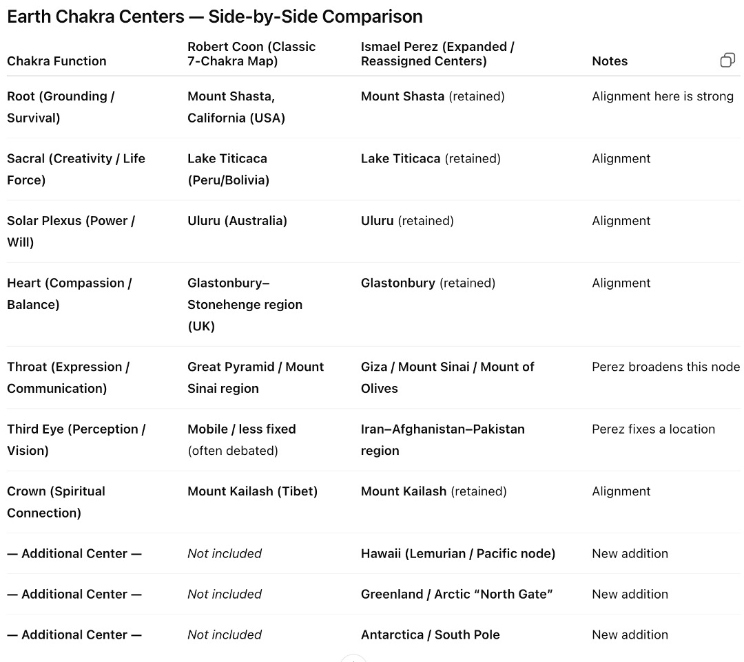 In a recent talk, Ismael Perez referenced additional locations on the Earth. These are included in the chart below, which compares the original Earth chakra sites identified by Robert Coon with the locations proposed by Perez.