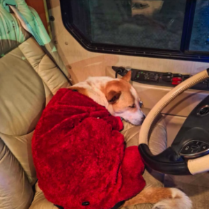 Aloka, now released from medical care, is recuperating and completing the remainder of the journey in the van — a temporary concession for a spirited companion accustomed to walking alongside the monks.