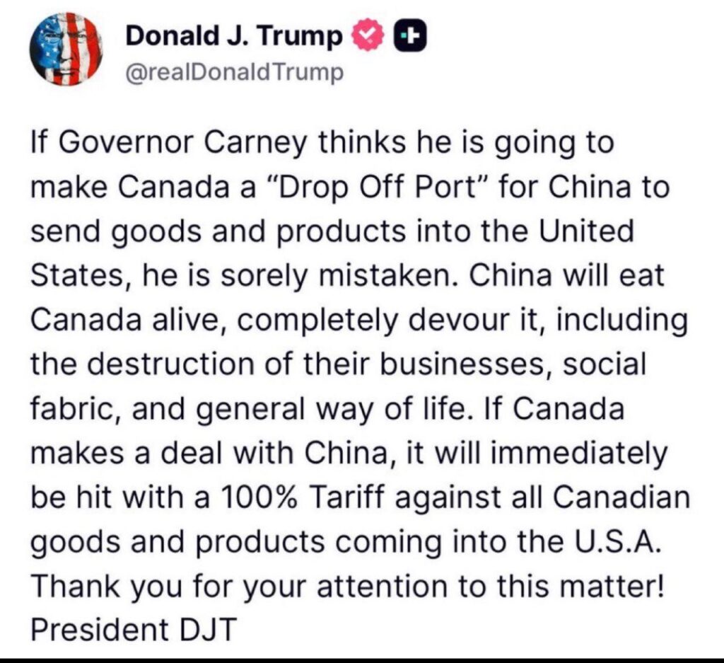 “If Canada makes a deal with China, it will immediately be hit with a 100% Tariff against all Canadian goods and products coming into the U.S.A. Thank you for your attention to this matter!”