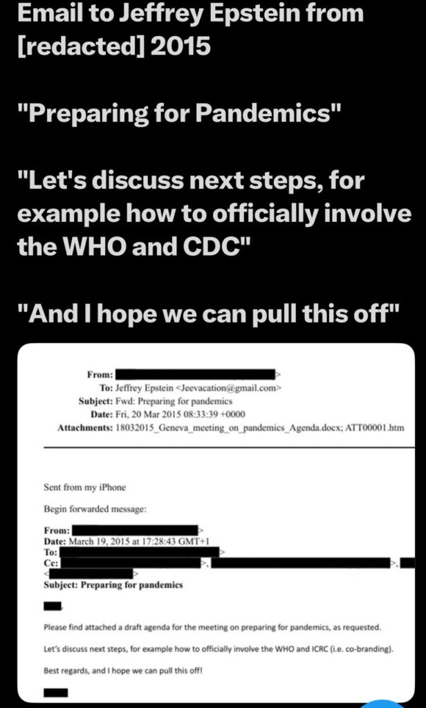“Preparing for Pandemic” in 2015, “Let’s discuss next steps, for example, how to officially involve the WHO and CDC.” “I hope we can pull this off.” Gates was planning the scamdemic with Epstein, WHO & CDC in 2015. No wonder he made so much money from the ‘vaccines’