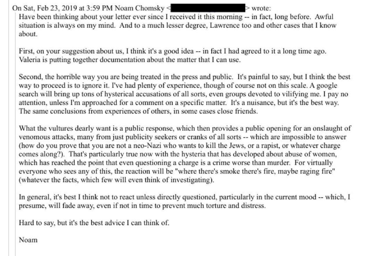 The most poignant symbol of this moral collapse is the continued defense of figures like the MIT, intellectual hero of the mostly Jew-ish, mostly upper class, “Brooklyn Left,” Noam Chomsky, whose correspondence with the convicted pedophile and sex-trafficker reveals a steadfast, post-conviction friendship, as well as his committed defense of his character, despite knowledge of his activities. More so, Chomsky’s wife had a relationship with Jeffrey and both accepted favors from him, including a $1400/night hotel.
