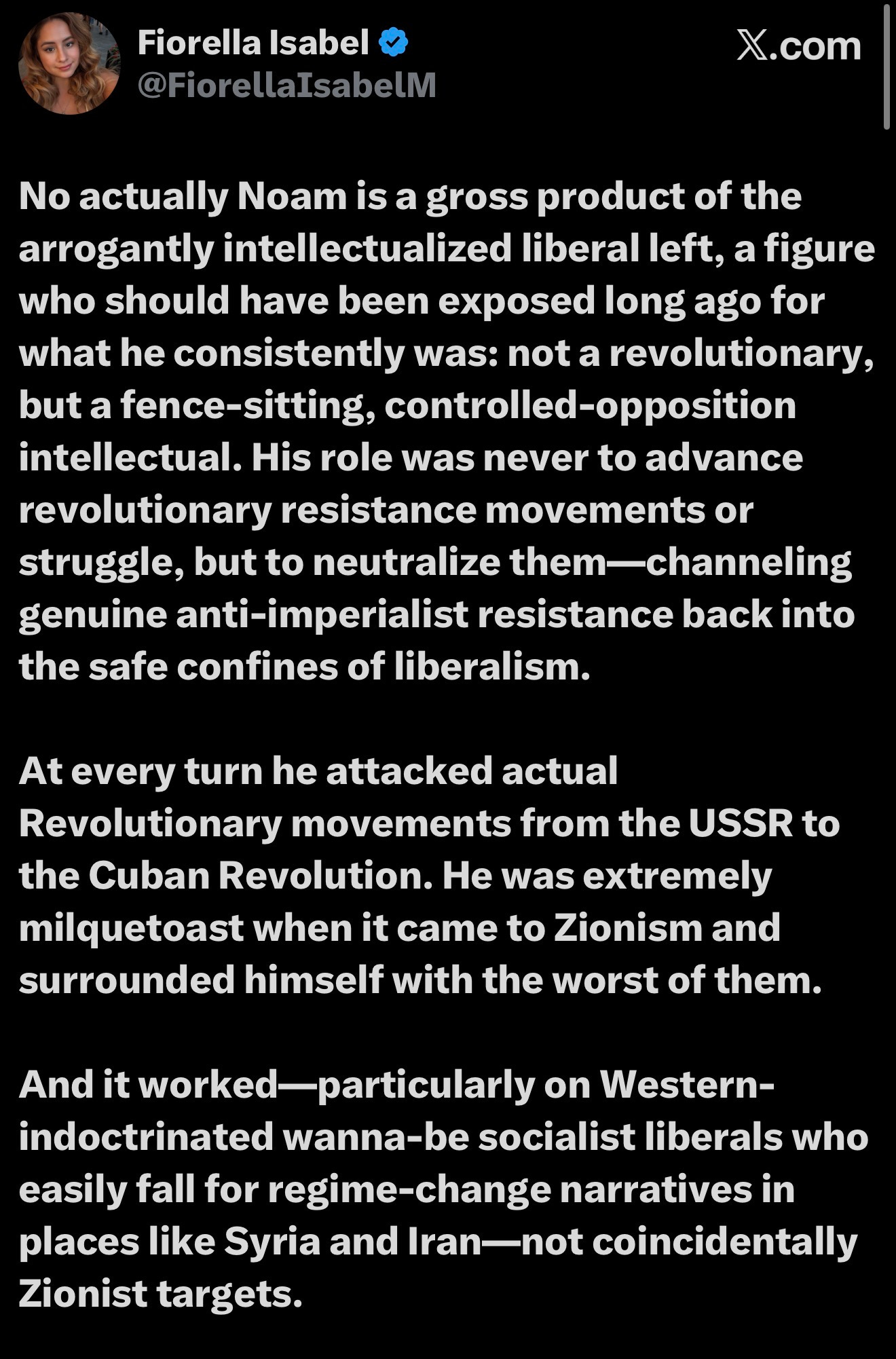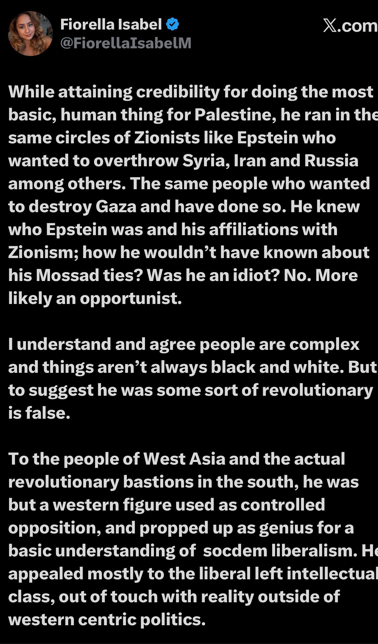 Many cite his defense of Palestine and Hezbollah, when he was invited and welcomes to speak, but in actuality, he did not believe in the BDS movement and surrounded himself with Zionists, including of course Epstein. After a high-profile 2006 visit to Lebanon where he met with leaders of Hezbollah and Hamas, he was reportedly banned from re-entering the country as Vanessa stated. The ban was likely imposed because figures within the Lebanese Axis of Resistance, recognized him not as a genuine ally, but as an intellectual whose analysis ultimately served to legitimize Western narratives and undermine revolutionary solidarity, making him, an unreliable or even counterproductive figure.