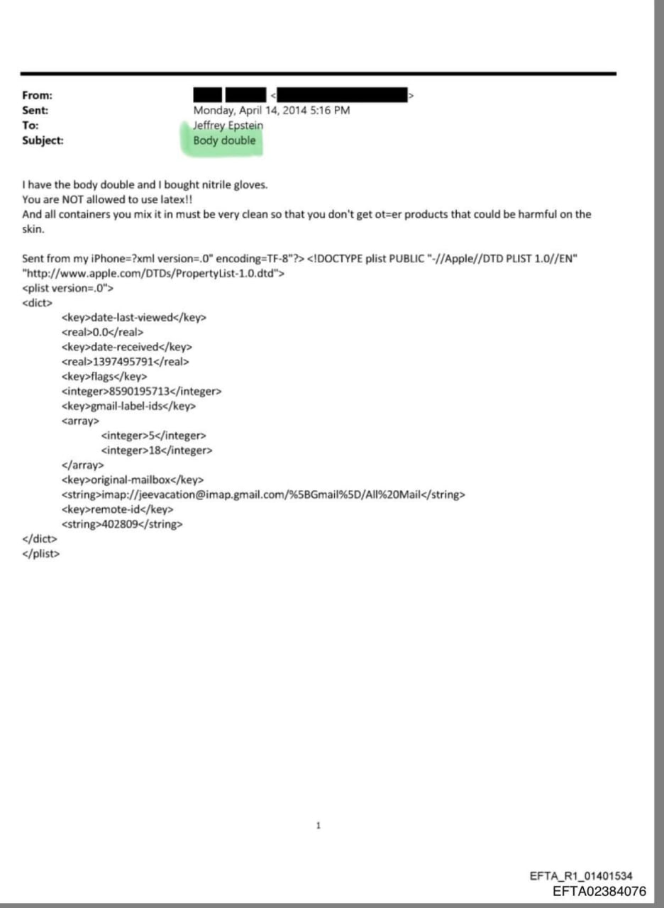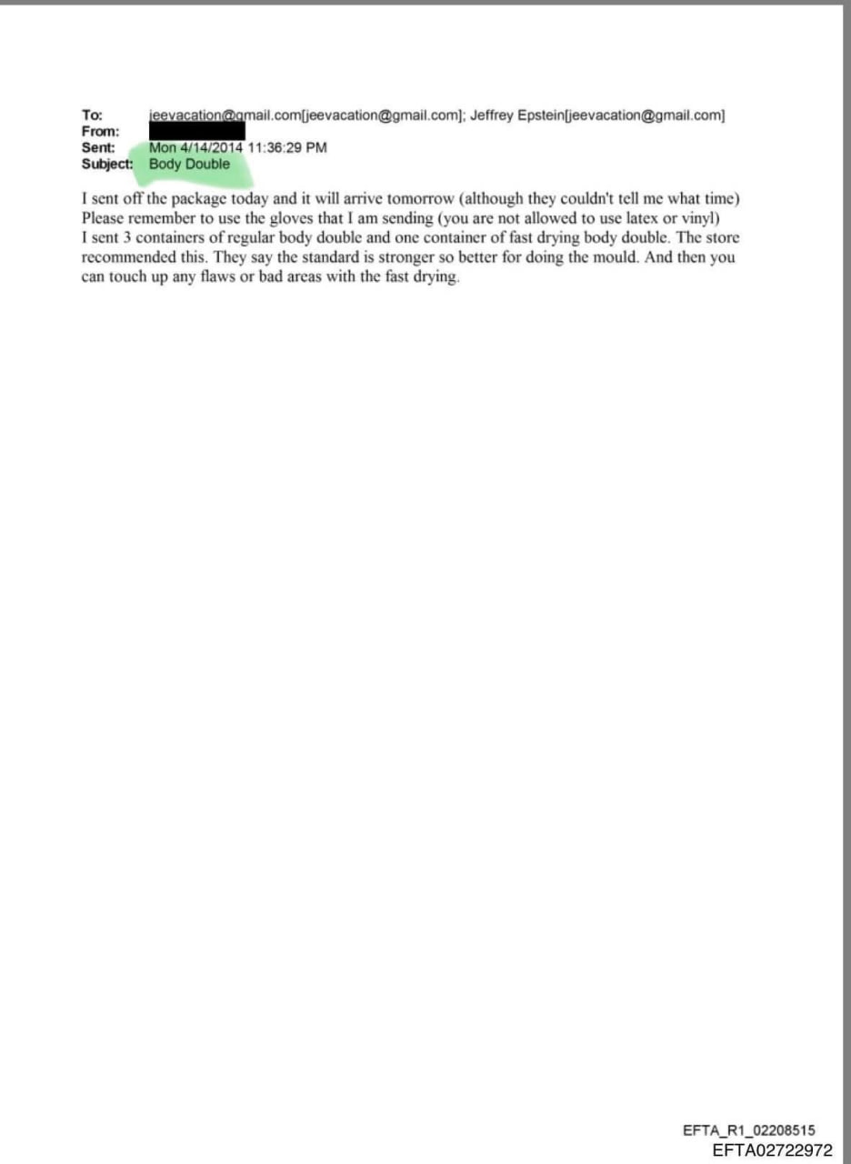 It also gets weird. An Epstein files search for “body double” reveals that Epstein allegedly had “3 containers of body double and one fast drying body double” made for him that involved a mold.