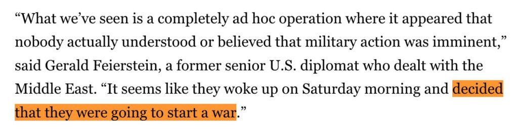 Gerald Feierstein, a former senior U.S. diplomat (CIAcalled the response “a completely ad hoc operation… like they woke up and decided to start a war.”