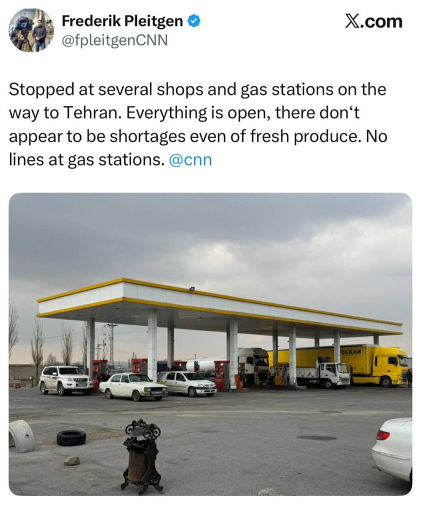 Media reports in the West are the opposite of reality. They make it seem Iran’s capital, Tehran, is being destroyed. However, a CNN correspondent who is actually there posts on X: Stopped at several shops and gas stations on the way to Tehran. Everything is open, and there don’t appear to be shortages, even of fresh produce. No lines at gas stations.”