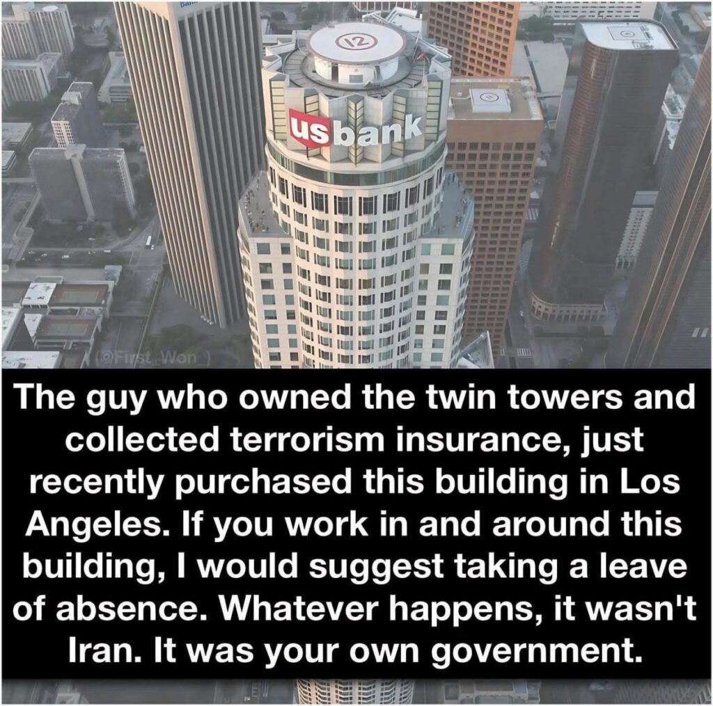 If you are in LA, you might want to move away from the US Bank Tower. Sources in LA say that Larry Silverstein of 911 fame has bought the US Bank Tower, LA’s tallest building. It is amazing Silverstein is not in jail, or even that he is still alive after his involvement in buying and insuring the World Trade Center Building immediately before 911. If he thinks he is going to blow up the Bank Tower and blame it on Iran, he had better understand nobody will be fooled this time. Silverstein is long overdue for his date with justice.