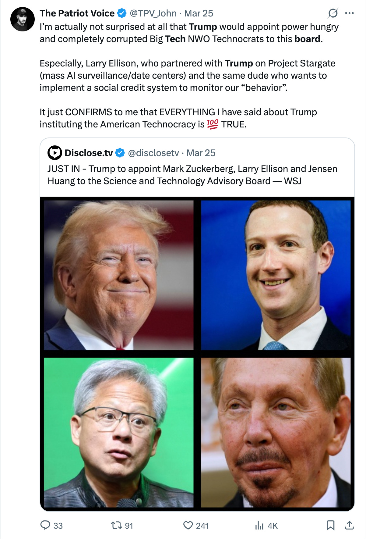 The recent announcement of a technology advisory board organized by the Trump administration — bringing the same consolidated tech players into direct coordination with executive policy — should be examined carefully, regardless of one’s political alignment. Centralized coordination between government and monopolized tech infrastructure is the capture mechanism, not the solution to it. Again, the so-called public sphere is doing the bidding of the State, because they ARE the State. The ideology of the person assembling the board does not change the architecture.