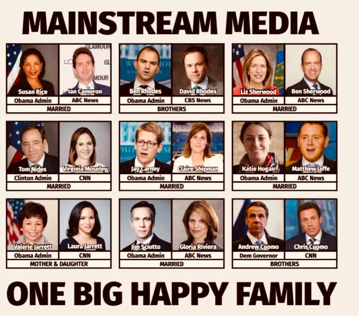 The below graphic, though years old, shows a glimpse of how incestuous the relations between administration officials and the media are. Think of this for a moment, when an administration had come to power, it had made thousands of promises to thousands of people regarding their compensation when they would come to power. Either straight up bribes, or kickbacks, or funneled money, or positions are given out as incentives. The result are compromised representatives at all levels of governments and institutions.