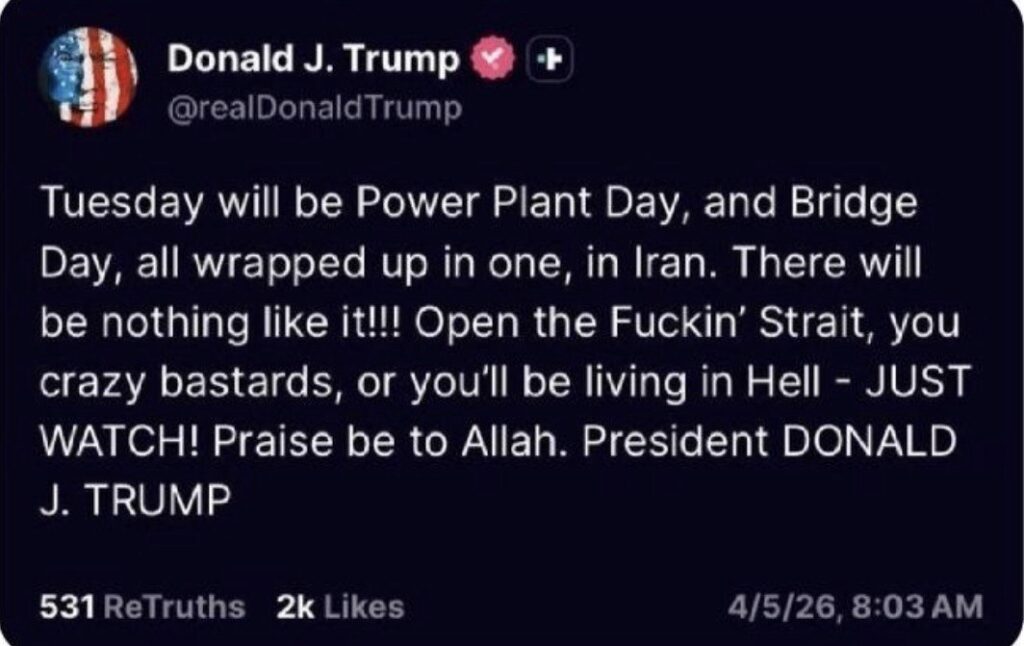 In the latest example, Trump tells Iran: “Open the Fuckin’ Strait, you crazy bastards, or you’ll be living in ell… Praise be to Allah.”