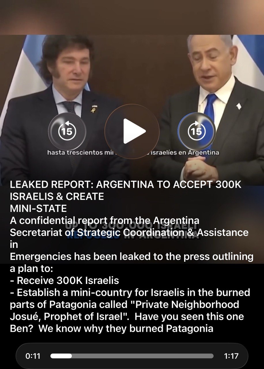 – Establish a mini-country for Israelis in the burned parts of Patagonia called “Private Neighborhood Josué, Prophet of Israel.” We know why they burned Patagonia.