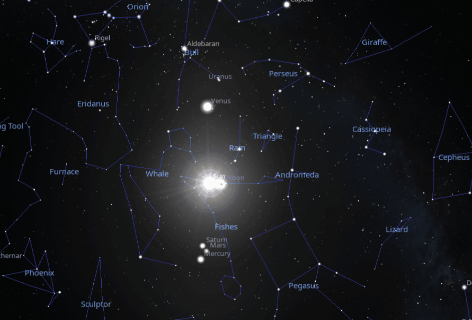 The Dark Moon — the conjunction of Moon and Sun — is in the last degrees of Pisces, disconnected from the rest of the stars.