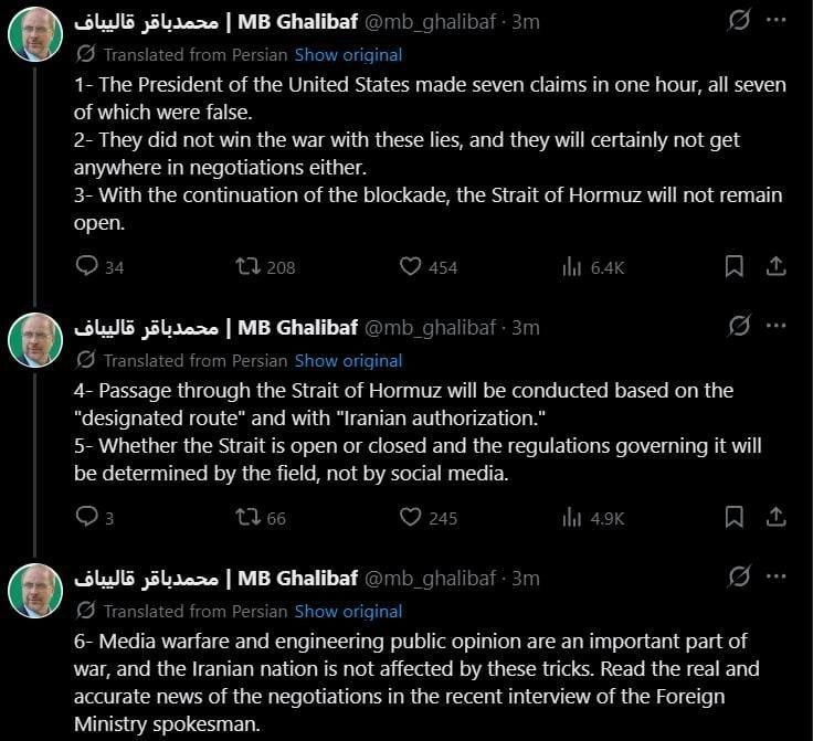 “The US President made seven statements in an hour, and all seven were lies. Whether the strait is open or closed, and the rules for its passage, are determined on the spot, not on social media…”We do not trust our adversaries, and should they make a mistake, Iran will immediately resume combat operations. Our armed forces are fully ready for that,” Ghalibaf stressed.