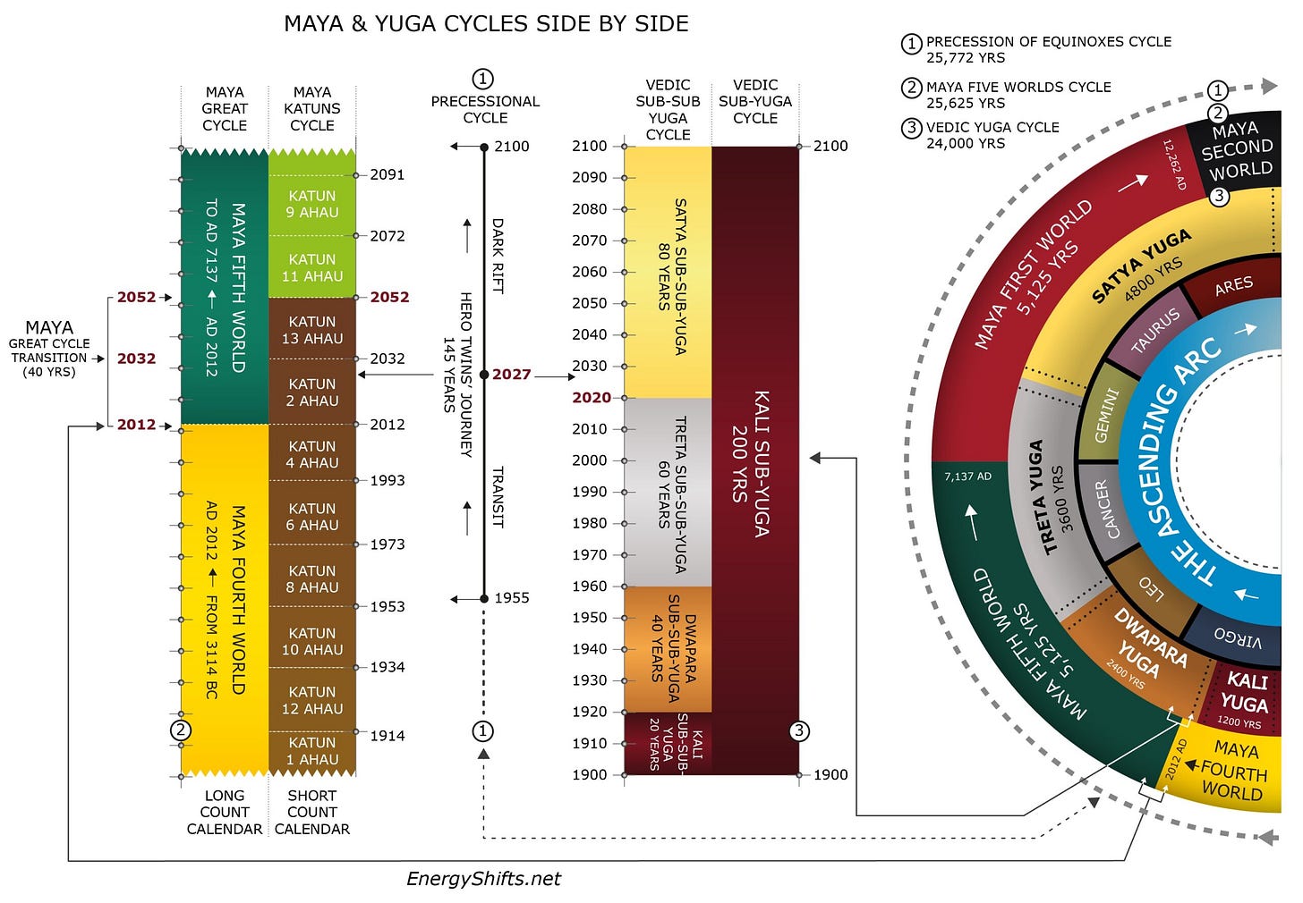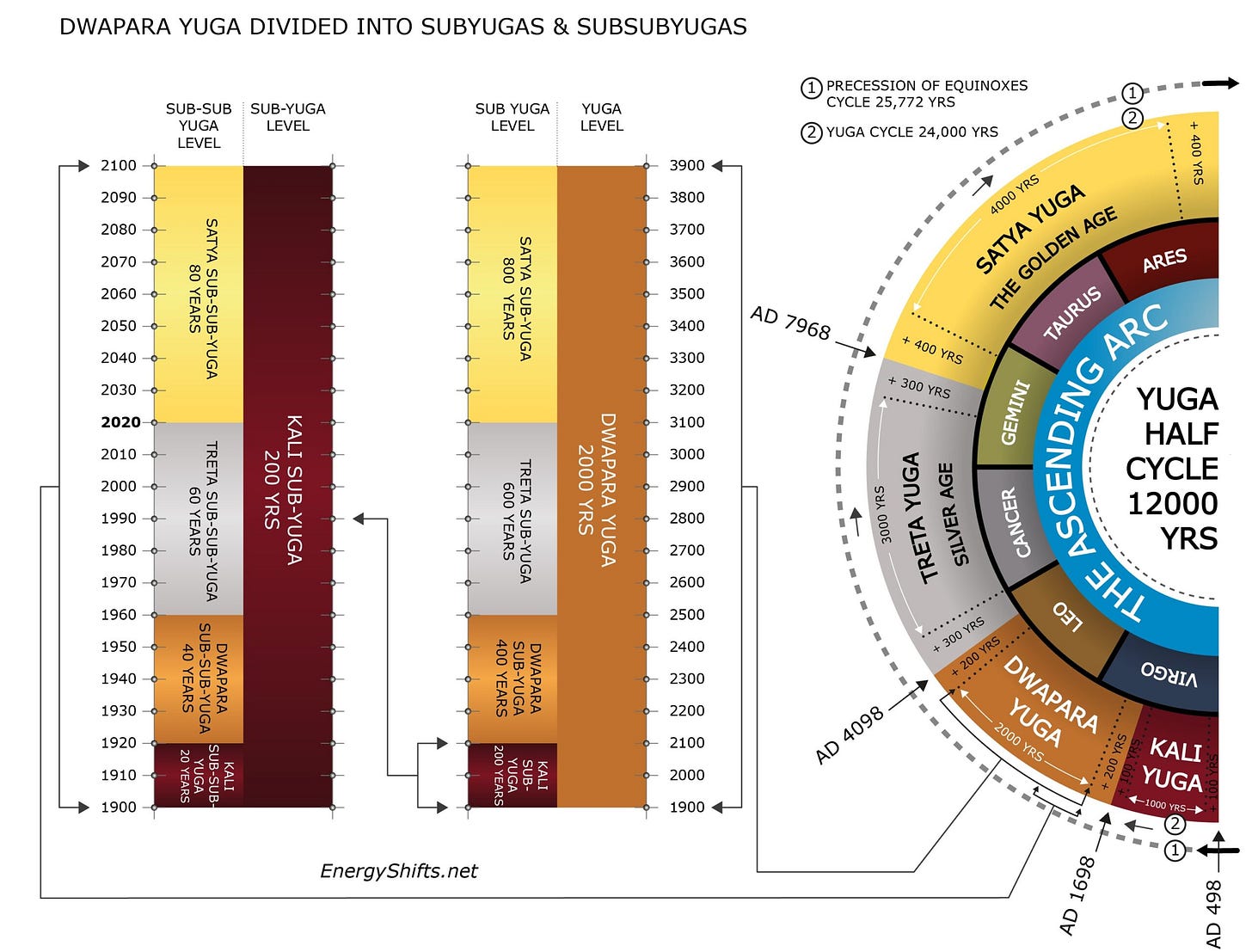 The Yuga system operates on nested scales, like Russian dolls of time. J.J. Montagnier’s research in Navigating The Greatest Shift in 26,000 Years maps this with precision that demands close attention. We are currently inside the Kali Subyuga — the Iron Age sub-segment of the larger Dwapara Yuga — running from 1900 to 2100. The Kali Subyuga is itself the darkest, most materialistic sub-season within the main energy cycle. But within that darkest sub-season, something critical happened in 2020: we crossed into the Satya Subsubyuga, the Golden Age segment nested inside the Iron Age segment, which will be active for eighty years between 2020 and 2100.